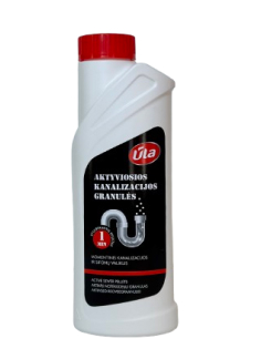 AKTYVIOSIOS KANALIZACIJOS GRANULĖS ŪLA 0,5 KG PASKIRTIS: Tirpina kanalizacijos vamzdžiuose ir sifonuose susikaupusias nuosėdas: riebalus, plaukus, muilo apnašas. Tinka valyti plastikinius vamzdžius. SUDĖTIS: Sudėtyje yra natrio hidroksido. NAUDOJIMAS: Prieš naudojimą indelį pakratyti. Įpilti 500 ml verdančio vandens į vonios, kriauklės, unitazo angą ir iš karto įpilti 1-2 kamštelius granulių. Nedideliu kiekiu karšto vandens užpilti ant grotelių likusias granules. Po 5 min. nuplauti didesniu kiekiu karšto vandens. Jei teršalai neištirpo, valymą pakartoti. SAUGA: Pavojinga. Smarkiai nudegina odą ir pažeidžia akis. Gali ėsdinti metalus. Laikyti vaikams neprieinamoje vietoje. Mūvėti apsaugines pirštines / dėvėti apsauginius drabužius / naudoti akių (veido) apsaugos priemones. Neįkvėpti dulkių / rūko / garų / aerozolio. PRARIJUS: Išskalauti burną. NESKATINTI vėmimo. PATEKUS ANT ODOS (arba plaukų): nedelsiant nuvilkti visus užterštus drabužius. Odą nuplauti vandeniu. PATEKUS Į AKIS: atsargiai plauti vandeniu kelias minutes. Išimti kontaktinius lęšius, jeigu jie yra ir jeigu lengvai galima tai padaryti. Toliau plauti akis. Nedelsiant skambinti į APSINUODIJIMŲ KONTROLĖS IR INFORMACIJOS BIURĄ / kreiptis į gydytoją. Laikyti užrakintą. LAIKYMAS: Vėsiose, sausose patalpose. Naudojimo terminas nurodytas ant pakuotės.