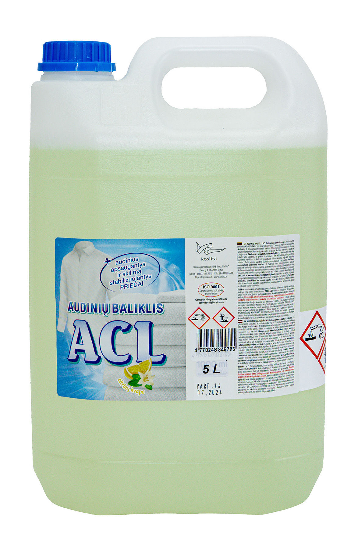 AUDINIŲ BALIKLIS ACL CITRINŲ KVAPO 5 L PASKIRTIS: Medvilniniams ir lininiams audiniams balinti ir dėmėms iš jų išimti. NAUDOJIMAS: Balinimas rankiniu būdu: 1. Atskieskite 1/5 stiklinės (40 ml) baliklio 10 litrų šilto (40-50) °C vandens. Nepilkite daugiau jokių skalbiklių. 2. Drabužius įmerkite ir palikite 20 minučių. 3.Rūpestingai išskalaukite šaltame vandenyje. Vandenį pakeiskite. 4. Įpilkite skalbimo priemonių ir skalbkite kaip įprastai. Skalbimas neautomatine skalbykle: 1. Į neautomatinę skalbyklę Įpilkite šalto vandens. 2. Įpilkite ½ stiklinės ( 100 ml) baliklio 20 litrų vandens. Skalbiklio nepilkite. 3. Sudėkite į skalbyklę baltus skalbinius ir įjunkite skalbyklę 10 min. Po to pakeitę vandenį skalbkite su skalbikliais kaip įprastai. Skalbimas automatine skalbimo mašina: 1. Sudėkite visus baltus skalbinius, kuriuos ruošiatės balinti į skalbimo mašiną. Įpilkite skalbimo miltelių. 2. Pasirinkite pradinio skalbimo programą ir įjunkite skalbimo mašiną. 3. Kai skalbimo mašina prisipildys vandens, lėtai supilkite pusę stiklines (100 ml) baliklio į pradinio skalbimo skyrelį. Unitazui ir vandentiekio vamzdynui plauti: naudokite neskiestą – įpilkite vieną stiklinę (200 ml) į unitazą ar kriauklę ir perplaukite po 15 minučių. Sienoms, grindims, kriauklėms ar voniai plauti: atskieskite 1 stiklinę (200 ml) baliklio 4 litrais vandens ir valykite šiuo skiediniu paviršius kempine ar skudurėliu, po to perplaukite švariu vandeniu. SUDĖTIS: mažiau kaip 5% baliklio chloro pagrindu, kvapnioji medžiaga. SAUGA: Pavojinga. Sudėtyje yra Natrio hipochlorito. Smarkiai nudegina odą ir pažeidžia akis. Labai toksiška vandens organizmams, sukelia ilgalaikius pakitimus. Laikyti vaikams neprieinamoje vietoje. Saugoti, kad nepatektų į aplinką. Mūvėti apsaugines pirštines/naudoti akių (veido) apsaugos priemones. PATEKUS Į AKIS: Kelias minutes atsargiai plauti vandeniu. Išimti kontaktinius lęšius, jeigu jie yra ir jeigu lengvai galima tai padaryti. Toliau plauti akis. Nedelsiant skambinti į APSINUODIJIMŲ KONTROLĖS IR INFORMACIJOS BIURĄ arba kreiptis į gydytoją. Turinį/talpyklą šalinti į atliekas pagal nacionalinius reikalavimus. Įspėjimas! Atsargiai! Nenaudoti kartu su kitais produktais. Gali išskirti pavojingas dujas (chlorą). LAIKYMAS: Aplinkos temperatūroje. Priemonė užšąla, atšilus savybės išlieka. Tinkamumo naudoti terminas nurodytas ant pakuotės. Jam pasibaigus naudoti dvigubą kiekį.