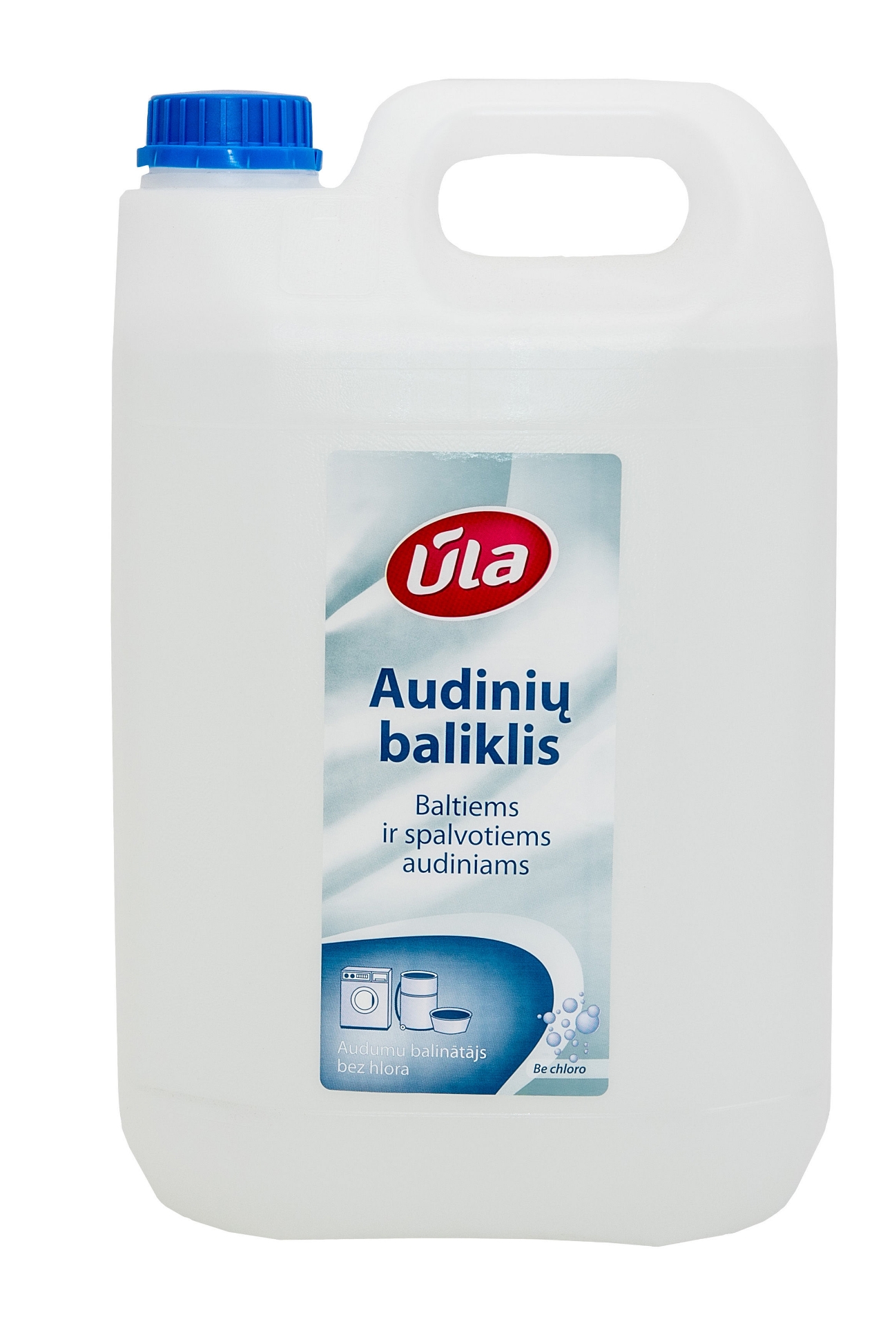 AUDINIŲ BALIKLIS ŪLA BALTIEMS IR SPALVOTIEMS AUDINIAMS (BE CHLORO) 5 L PASKIRTIS: Audinių baliklis „Ūla“ naudojama kartu su skalbimo milteliais efektyviai pašalina net sunkiai išplaunamas ir įsisenėjusias dėmes, tokias kaip raudonojo vyno, arbatos, kavos, žolės, purvo ir kitas. Jame nėra chloro, todėl gali būti naudojamas ir spalvotiems bei lengvai pažeidžiamiems audiniams, tokiems kaip šilkui bei vilnai. Švelni dėmių šalinimo priemonė atgaivina ir išsaugo spalvas skalbiant daugybę kartų. Audinių baliklis „Ūla“ puikiai veikia bet kokios temperatūros vandenyje.