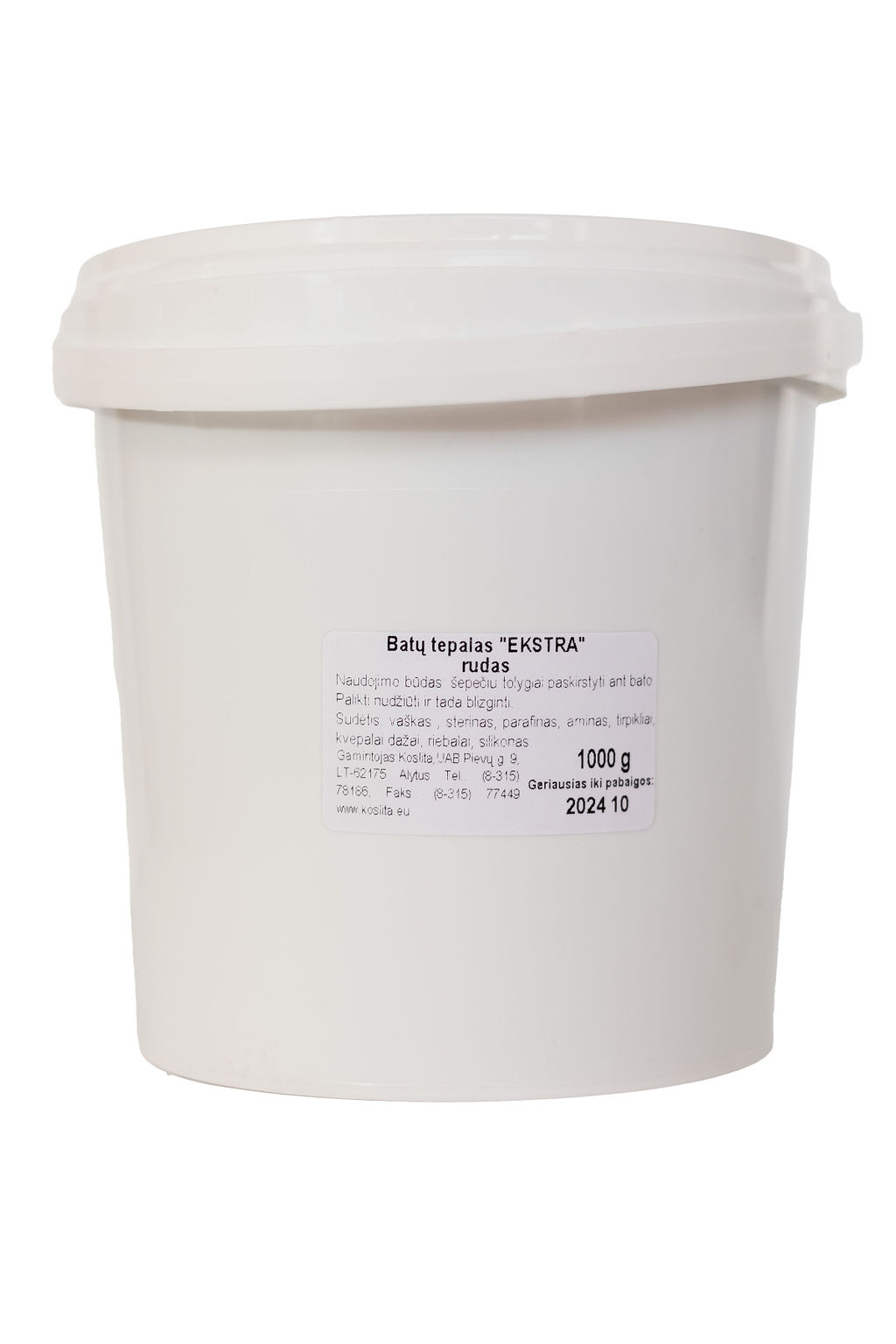BATŲ TEPALAS EKSTRA RUDAS 1 KG PASKIRTIS: Skirtas avalynės priežiūrai. Panaudoti aukštos kokybės vaškai, padengiantys avalynę apsaugine plėvele ir suteikiantys jai blizgesį. Šis batų tepalas pasižymi dideliu atsparumu vandeniui, užglaisto įtrūkimus, puikiai įsigeria į odą, maloniai kvepia. NAUDOJIMAS: Nusukti dangtelį, kempinėlės ar batų šepečio pagalba tolygiai paskirstyti ant bato. Palikti nudžiūti ir tada nublizginti. SUDĖTIS: vaškai, stearinas, parafinas, aminas, tirpikliai, dažikliai, kvapnioji medžiaga. Sauga: Laikyti vaikams neprieinamoje vietoje. LAIKYMAS: Vėsioje, sausoje patalpoje. Tinkamumo naudoti terminas nurodytas ant pakuotės.