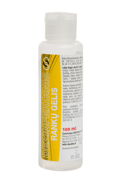 DEZINFEKCINIS RANKŲ GELIS 100 ML PASKIRTIS: Rankų dezinfekantas pagamintas denatūruoto etilo alkoholio pagrindu. Asmens higienos dezinfekantas (1 produkto tipas). Higieninei rankų dezinfekcijai asmens sveikatos priežiūros įstaigose, maisto pramonės, visuomeninės paskirties objektuose ir buityje. Negali būti naudojamas žaizdoms ir pažeistai odai gydyti. Biocido autorizacijos liudijimo Nr. Nr. (10-14 17.5E) BPR-410 (A-01VNO603605-20-213) galioja iki 2024-04-17. Sudėtis: Didecildimetilamonio chloridas, CAS Nr. 7173-51-5, EB Nr. 230-525-2, 0,25 %; etanolis (denatūruotas), CAS Nr. 64-17-5, EB Nr. 200-578-6;72,0 %. Sudėtyje yra odą minkštinančių priedų glicerino ir monopropilenglikolio. Savybės: Veikia baktericidiškai (Pseudomonas aeruginosa, Escheria coli, Enterecoccus hirae, Staphylococcus aureus, mikobaktericidiškai (TBC), fungicidiškai (Candida albicans ir A.brasiliensis ) ir virucidiškai. Gelinės konsistencijos produktas. Naudoiimas: DEZINFEKCINIS RANKŲ GELIS skirtas higieninei rankų dezinfekcijai asmens sveikatos priežiūros, socialinės globos ir rūpybos įstaigose, kirpyklose, kosmetikos ir tatuiruočių kabinetuose, grožio salonuose bei higieninei rankų dezinfekcijai buityje. Higieninei rankų dezinfekcijai į švarias sausas rankai masažuojant įtrinti 3,0-5,0 ml produkto. Ekspozicijos laikas 30 sek. Ekspozicijos metu oda turi būti drėgna.Pavojinga. Labai degūs skystis ir garai. Laikyti vaikams neprieinamoje vietoje. Laikyti atokiau nuo šilumos šaltinių, karštų paviršių, žiežirbų, atviros liepsnos arba kitų degimo šaltinių. Nerūkyti. Talpyklą laikyti sandariai uždarytą. Laikyti vėsioje vietoje. Turinį/talpyklą šalinti pagal nacionalinius reikalavimus. Atsargumo priemonės: Tik išoriniam naudojimui. Vengti kontakto su akimis. Nenaudoti veido odos ir gleivinių dezinfekcijai, žaizdoms ir pažeistai odai gydyti. Laikyti pašaliniams neprieinamoje vietoje. Laikyti pakuotę sandariai uždarytą, ne aukštesnėje kaip +25 °C temperatūroje, vengti tiesioginių saulės spindulių. Abejojant, kad produktas gali sukelti dirginimą/alergiją, visada išbandyti ant nedidelio ploto. Biocidinius produktus naudokite saugiai. Prieš naudodami visuomet perskaitykite etiketę ir informaciją apie produktą.