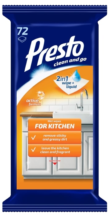DRĖGNOS SERVETĖLĖS VIRTUVEI PRESTO CLEAN yra sukurtos greitam ir patogiam paviršių valymui. Pakuotėje yra 72 vnt servetėlių, kurios lengvai pašalina riebalus, dėmes ir maisto likučius nuo virtuvės stalviršių, plytelių ar kitų paviršių. Jos užtikrina švarą be pastangų ir yra būtinos kiekvienoje virtuvėje.