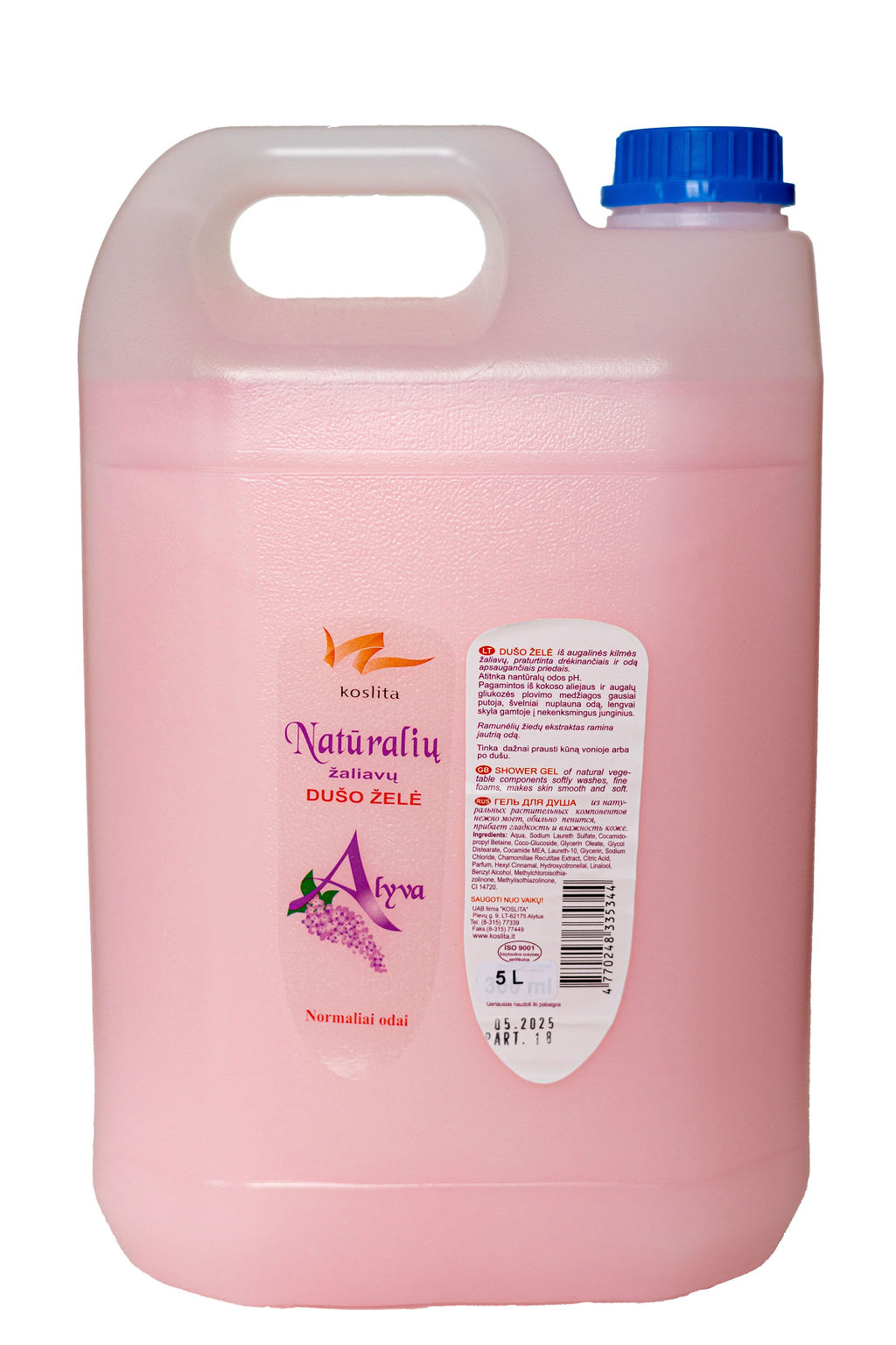 DUŠO ŽELĖ ALYVA NORMALIAI ODAI 5 L Dušo želė ne tik švariai nuplauna nuo odos paviršiaus susikaupusius nešvarumus, bet ir švelniai veikia odą, suteikia jai ilgai juntamą, malonų aromatą. Želė plaunamosios medžiagos, pagamintos iš natūralaus kokoso palmių aliejaus, augalų gliukozės, gausiai putoja. Alijošiaus ekstraktas saugo nuo odos uždegimų, gerina audinių regeneraciją. Sudėtyje esantis glicerinas drėkina odą ir daro ją elastingą. Sudėtyje esantis kviečių baltymas palaiko odos medžiagų pusiausvyrą, stimuliuoja kraujotaką. LAIKYMAS: Kambario temperatūroje, sausoje patalpoje. Tinkamumo naudoti terminas nurodytas ant pakuotės.