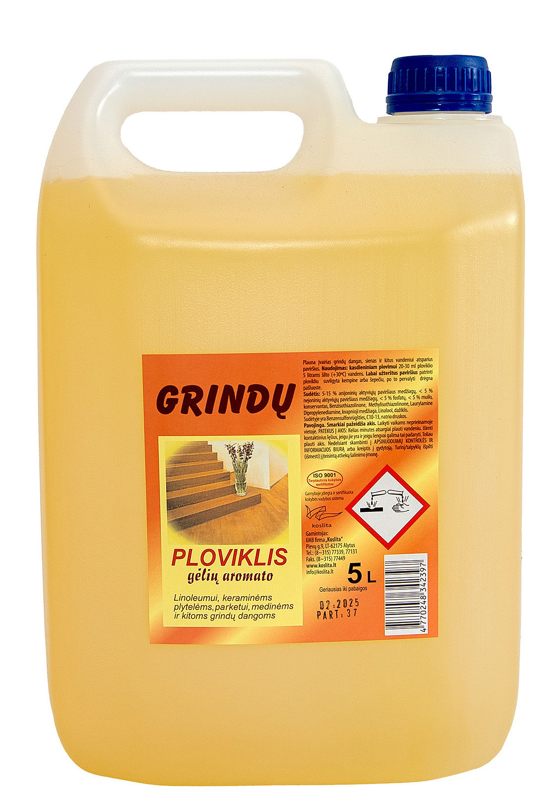 GRINDŲ PLOVIKLIS GĖLIŲ AROMATO 5 L PASKIRTIS: Skirtas parketui, lakuotoms, dažytoms medinėms grindims plauti. Augalinių aliejų muilas padengia plaunamą paviršių apsaugine plėvele, suteikia blizgesį. SUDĖTIS: 5-15 % anijoninių paviršinio aktyvumo medžiagų, < 5 % nejoninių paviršinio aktyvumo medžiagų, < 5 % fosfatų, < 5 % muilo, konservantas, Benzisothiazolinone, Methylisothiazolinone, Laurylamine Dipropylenediamine kvapnioji medžiaga.