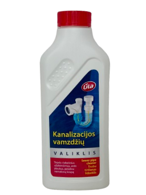 KANALIZACIJOS VAMZDŽIŲ VALIKLIS ŪLA 0,55 L PASKIRTIS: Tirštas skystis greitai ir efektyviai emulguoja kanalizacijos vamzdžiuose susikaupusius nešvarumus, tirpdo riebalus, ardo plaukus, pašalina nemalonų kvapą. Tinka nutekamiesiems vamzdžiams valyti profilaktiškai.