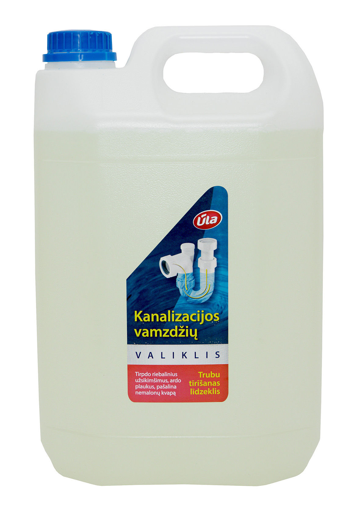 KANALIZACIJOS VAMZDŽIŲ VALIKLIS ŪLA 5 L PASKIRTIS: Tirštas skystis greitai ir efektyviai emulguoja kanalizacijos vamzdžiuose susikaupusius nešvarumus, tirpdo riebalus, ardo plaukus, pašalina nemalonų kvapą. Tinka nutekamiesiems vamzdžiams valyti profilaktiškai.