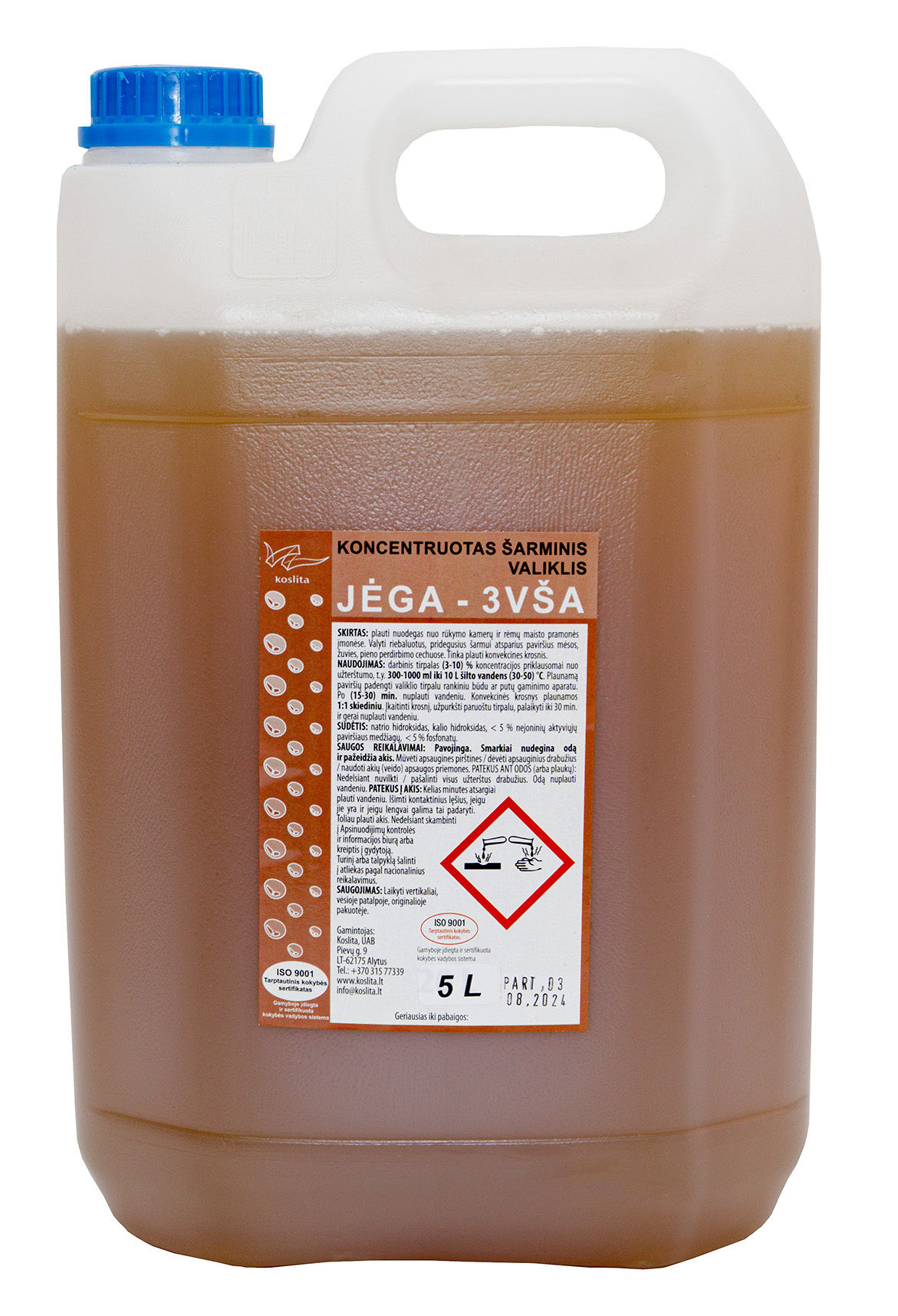KONCENTRUOTAS ŠARMINIS VALIKLIS JĖGA-3VŠA 5 L PASKIRTIS: Skirtas nuodegų plovimui nuo rūkymo kamerų ir rėmų maisto pramonės įmonėse, konvencinių krosnių plovimui. Tinka ypač riebaluotų, pridegusių, aprūkusių, šarmui atsparių paviršių valymui mėsos, žuvies, pieno perdirbimo cechuose. Valiklio darbinis tirpalas pasižymi mažesniu putojimu, kuris neturi įtakos valymo kokybei. Stiprus šarminis produktas (pH-13,0). NAUDOJIMAS: Rūkymo kameroms plauti naudojamas 3-10 % koncentracijos, priklausomai nuo užterštumo. Ruošiant 10 l darbinio tirpalo 300-1000 ml ploviklio – atitinkamai įpilti iki 10 litrų šilto (30-50) ºC vandens. Plaunamą paviršių padengti valiklio tirpalu rankiniu būdu ar putų gaminimo aparatu, po 15-30 min. nuplauti vandeniu. Konvekcinėms krosnims plauti naudojamas 50 % koncentracijos tirpalas t.y. 5000 ml – 5000 ml šilto vandens. Įkaitinti krosnį iki 70 ºC, išpurkšti paruoštu tirpalu, po 30 min. gerai nuplauti vandeniu. SUDĖTIS: Natrio hidroksidas, kalio hidroksidas, nejoninė paviršinio aktyvumo medžiaga, fosfonatas. SAUGOS PRIEMONĖS: Pavojinga. Sudėtyje yra Natrio hidroksido. Smarkiai nudegina odą ir pažeidžia akis. Mūvėti apsaugines pirštines/ dėvėti apsauginius drabužius/naudoti akių (veido) apsaugos priemones. PATEKUS ANT ODOS (arba plaukų): Nedelsiant nuvilkti/pašalinti visus užterštus drabužius. Odą nuplauti vandeniu/čiurkšle. PATEKUS Į AKIS: Kelias minutes atsargiai plauti vandeniu. Išimti kontaktinius lęšius, jeigu jie yra ir jeigu lengvai galima tai padaryti. Toliau plauti akis. Nedelsiant skambinti į Apsinuodijimų kontrolės ir informacijos biurą arba kreiptis į gydytoją. Turinį arba talpyklą šalinti į atliekas pagal nacionalinius reikalavimus. SAUGOJIMAS: Laikyti vertikaliai, vėsioje patalpoje, originalioje pakuotėje. Tinkamumo naudoti terminas nurodytas ant pakuotės.