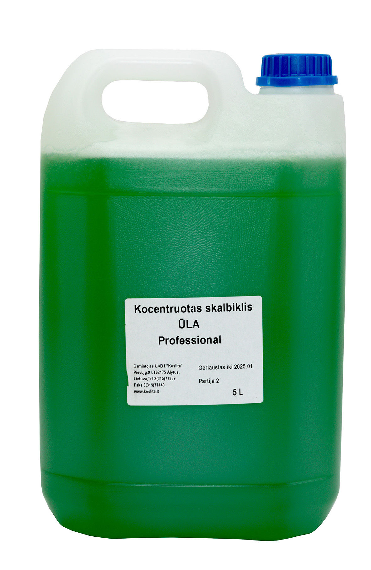 KONCENTRUOTAS SKALBIKLIS ŪLA PROFESSIONAL 5 L PASKIRTIS: Skystas skalbiklis su fermentais skirtas skalbti stipriau užterštiems, dėmėtiems spalvotiems skalbiniams rankomis ir automatinėmis skalbimo mašinomis. Be fosfatų. Sudėtyje esantys fermentai patenka į audinio pluoštą ir tirpina įvairios kilmės dėmes. Skalbdami vadovaukitės gamintojų rekomendacijomis.