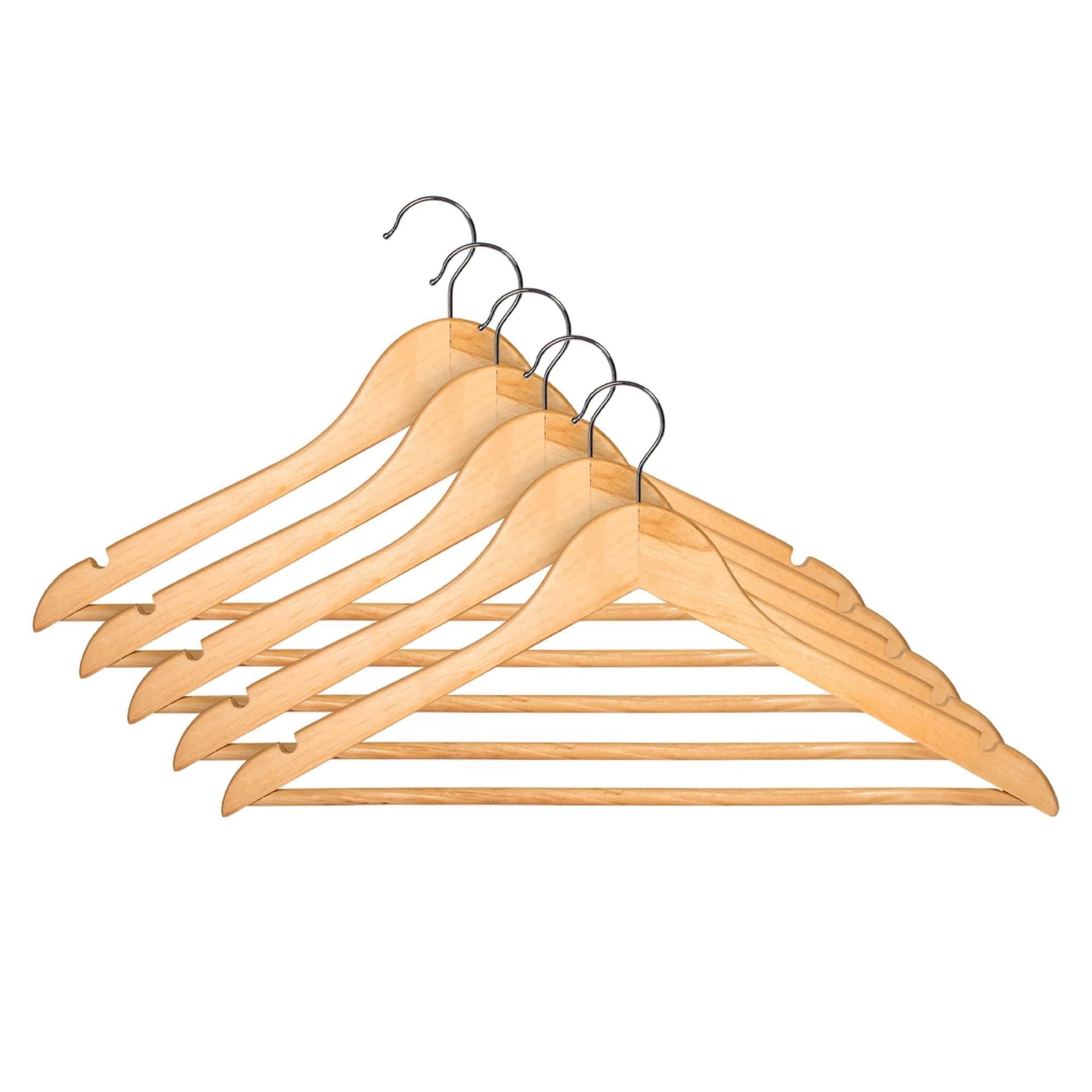 Aukštos kokybės šviesios medienos pakabai su skersiniu, skirti drabužių kabinimui. Komplekte – 5 vienetai.