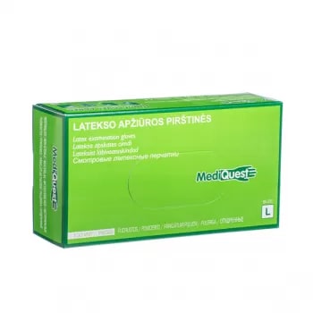 MediQuest lateksinės nesterilios pirštinės L (100 vnt.) – vienkartinės, su pudra, iš natūralaus latekso, su sustiprintu susuktu rankogaliu ir puikiu atsparumu cheminėms medžiagoms, skirtos medicinos ar laboratoriniam darbui.