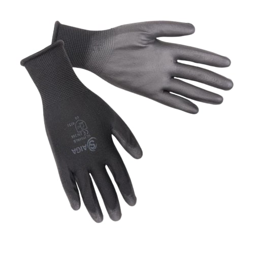 PIRŠTINĖS MEGZTOS LIETOS JUODU POLIURETANU yra megztos darbines pirštinės, aplietos juodu poliuretanu, su ištisiniu delnu ir trikotažiniu rankogaliu. Šios pirštinės užtikrina patogų dėvėjimą, o aplieta danga suteikia geresnį sukibimą bei atsparumą dilimui. Jos yra tinkamos įvairiems darbams, pavyzdžiui, statybose, mechanikoje ar dirbant su įrankiais, reikalaujančiais geresnio sukibimo ir apsaugos​