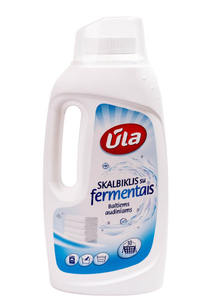 SKALBIKLIS ŪLA SU FERMENTAIS BALTIEMS AUDINIAMS 1,5 L PASKIRTIS: Skystas skalbiklis „Ūla“ su fermentais skirtas skalbti stipriau užterštiems, dėmėtiems baltiems skalbiniams rankomis ir automatinėmis skalbimo mašinomis. Be fosfatų. Sudėtyje esantys fermentai ir natūralios kilmės tulžis patenka į audinio pluoštą ir tirpina įvairios kilmės dėmes. Specialios medžiagos, esančios skalbiklio sudėtyje paryškina audinio baltumą, saugo nuo pilkėjimo. Skalbiklis „Ūla“ puikiai išskalbs baltus medvilninius, lininius ir visų rūšių sintetinius audinius. Skalbdami vadovaukitės gamintojų rekomendacijomis.SUDĖTIS: 5-15 % anijoninių aktyviųjų paviršiaus medžiagų, < 5 % nejoninių aktyviųjų paviršiaus medžiagų, < 5 % muilo, optiniai balikliai, tulžis, fermentai, konservantas, Benzisothiazolinone, Methylisothiazolinone, Laurylamine Dipropylenediamine, kvapioji medžiaga