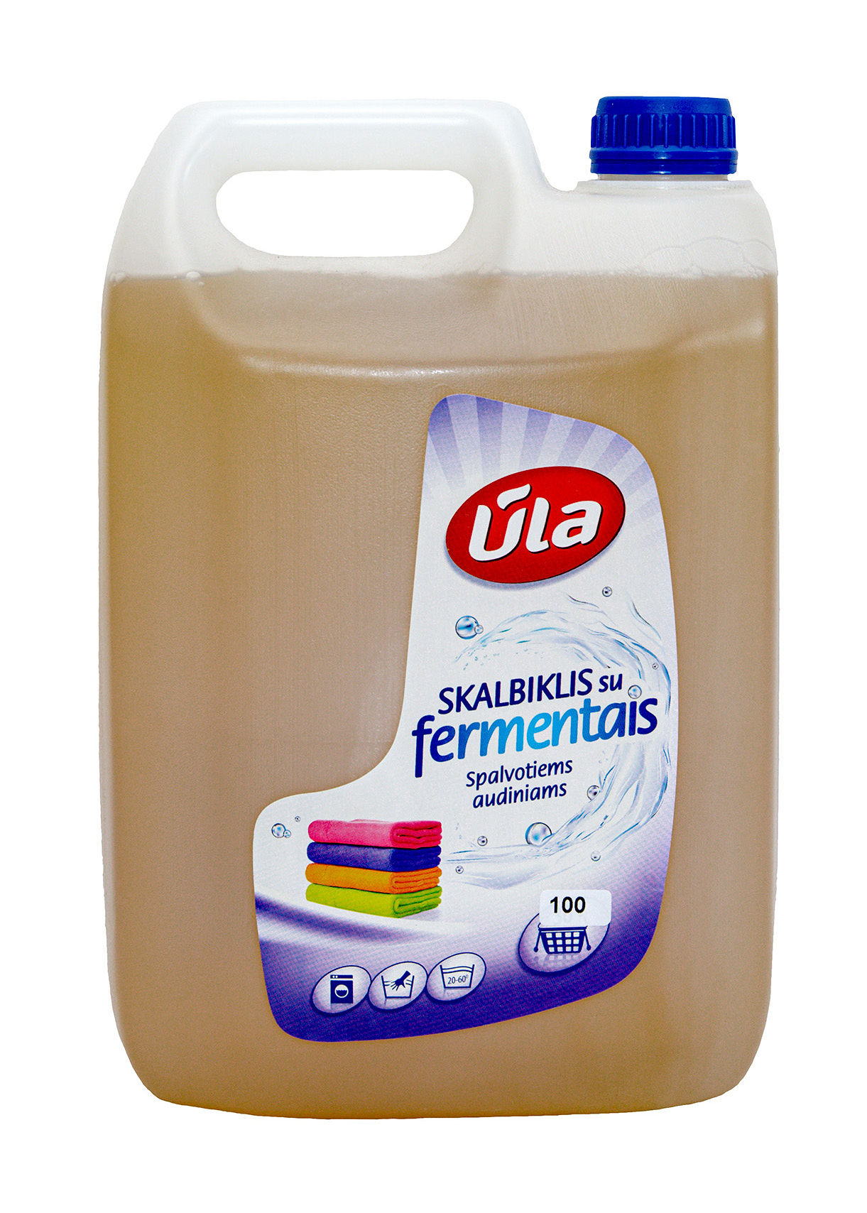 SKALBIKLIS ŪLA SU FERMENTAIS SPALVOTIEMS AUDINIAMS 5 L PASKIRTIS: Skystas skalbiklis „Ūla“ su fermentais skirtas skalbti stipriau užterštiems, dėmėtiems spalvotiems skalbiniams rankomis ir automatinėmis skalbimo mašinomis. Be fosfatų. Sudėtyje esantys fermentai ir natūralios kilmės tulžis patenka į audinio pluoštą ir tirpina įvairios kilmės dėmes. Specialios medžiagos, esančios skalbiklio sudėtyje, padeda išsaugoti audinio spalvas, suteikia malonų kvapą. Skalbiklis „Ūla“ puikiai išskalbs spalvotus medvilninius, lininius ir visų rūšių sintetinius audinius. Skalbiniai neišbluks ir maloniai kvepės. Skalbdami vadovaukitės gamintojų rekomendacijomis. SUDĖTIS: 5-15 % anijoninių aktyviųjų paviršiaus medžiagų, < 5% nejoninių aktyviųjų paviršiaus medžiagų, < 5% muilo, tulžis, fermentai, konservantas, Benzisothiazolinone, Methylisothiazolinone, Laurylamine Dipropylenediamine, kvapioji medžiaga.