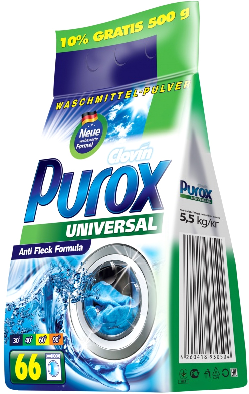 SKALBIMO MILTELIAI PUROX UNIVERSAL - universalūs skalbimo milteliai yra pritaikyti įvairių tipų drabužiams – tiek spalvotiems, tiek baltiems audiniams. „Purox Universal“ skalbimo milteliai yra efektyvūs šalinant įprastas dėmes ir nešvarumus, todėl tinka kasdieniam naudojimui. Jie gali būti naudojami tiek skalbimo mašinose, tiek skalbiant rankomis. Produktas apsaugo audinius nuo dėmių kaupimosi ir padeda išvengti kalkių nuosėdų formavimosi skalbimo mašinoje.