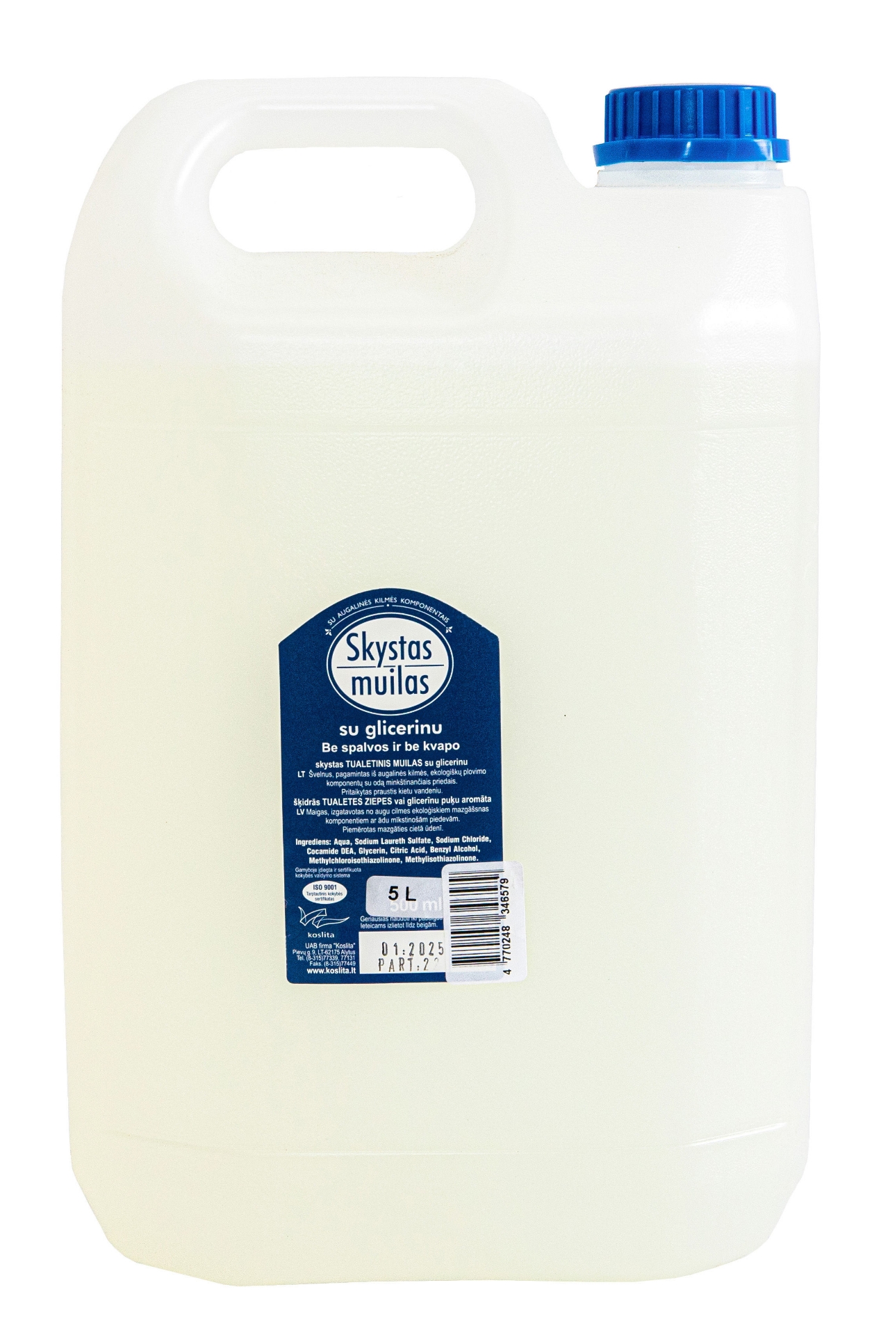 SKYSTAS MUILAS BE KVAPO IR SPALVOS 5 L PASKIRTIS: asmens higienai rankoms ir kūnui plauti. Skirtas plauti rankas maisto pramonės įmonėse, sveikatos priežiūros įstaigose, viešbučiuose, komunaliniuose objektuose ir buityje. Pritaikytas stacionarių muilo dozatorių pildymui, naudojant kaip rankų valymo priemonę. NAUDOJIMAS: naudojamas neskiestas. Ant sudrėkintų vandeniu ranku vieną kartą paspaudus muilo dozatoriaus rankenėle, užlašinti skysto muilo. Kruopščiai 10-15 sek. plauti rankas, nuskalauti vandeniu ir nusausinti vienkartiniu rankšluosčiu arba servetėle. SUDĖTIS: švelnios, augalinės kilmės paviršinio aktyvumo medžiagos, glicerinas. SAVYBĖS: tirštas, koncentruotas, švelnus rankoms, gausiai putojantis, efektyviai plaunantis su įvairiais pagerinančiais priedais. Neturi dažančių medžiagų, tinka jautriai, sausai odai. Muilo sudėtyje esantis glicerinas minkština, drėkina odą. SAUGAUS DARBO TAISYKLĖS: naudoti pagal paskirtį. LAIKYMAS: Laikyti sausoje, vėsioje vietoje.