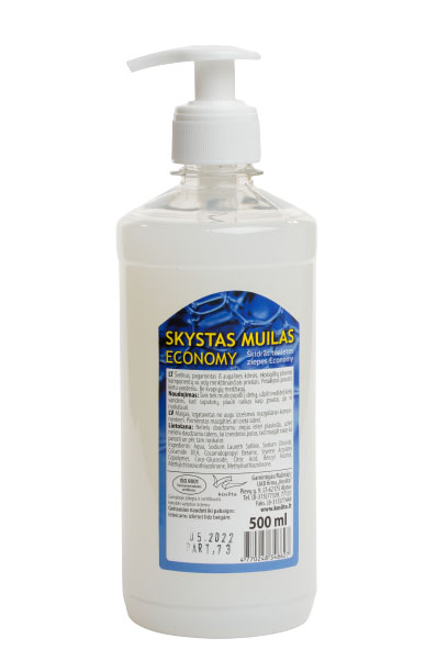SKYSTAS MUILAS ECONOMY 0,5 L PASKIRTIS: Švelnus, pagamintas iš augalinės kilmės ekologiškų plovimo komponentų, su odą minkštinančiais priedais. Skirtas plauti rankas maisto pramonės įmonėse, sveikatos priežiūros įstaigose, viešbučiuose, komunaliniuose objektuose ir buityje. Pritaikytas stacionarių muilo dozatorių pildymui, naudojant kaip rankų valymo priemonę. Be kvapniųjų medžiagų, tinka naudoti kur reikalingas muilas be kvapo. NAUDOJIMAS: naudojamas neskiestas. Ant sudrėkintų vandeniu rankų vieną kartą paspaudus muilo dozatoriaus rankenėle, užlašinti skysto muilo. Kruopščiai 10-15 sek. plauti rankas, nuskalauti vandeniu ir nusausinti vienkartiniu rankšluosčiu arba servetėle. INGREDIENTS: Aqua, Sodium Laureth Sulfate, Sodium Chloride, Cocamide DEA, Cocamidopropyl Betaine, Styrene Acrylates Copolymer, Coco-Glucoside, Citric Acid, Glycerine, Benzyl Alcohol, Methylchloroisothiazolinone, Methylisothiazolinone.