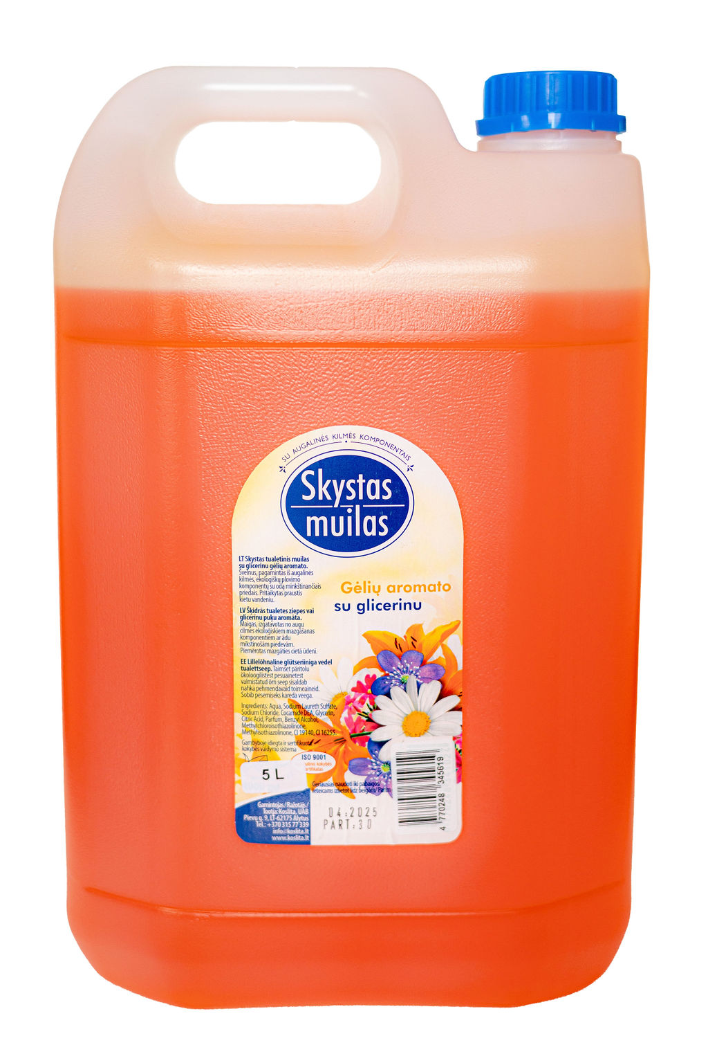 SKYSTAS MUILAS GĖLIŲ AROMATO SU GLICERINU 5 L PASKIRTIS: Skirtas plauti rankas maisto pramonės įmonėse, sveikatos priežiūros įstaigose, viešbučiuose, komunaliniuose objektuose ir buityje. Pritaikytas stacionarių muilo dozatorių pildymui, naudojant kaip rankų valymo priemonę. Tirštas, koncentruotas, sąlyginai švelnus rankoms, gausiai putojantis, efektyviai plaunantis su įvairiais pagerinančiais priedais. Muilo sudėtyje esantis glicerinas minkština, drėkina odą. NAUDOJIMAS: naudojamas neskiestas. Ant sudrėkintų vandeniu rankų vieną kartą paspaudus muilo dozatoriaus rankenėle, užlašinti skysto muilo. Kruopščiai 10-15 sek. plauti rankas, nuskalauti vandeniu ir nusausinti vienkartiniu rankšluosčiu arba servetėle. INGREDIENTS: Aqua, Sodium Laureth Sulfate, Sodium Chloride, Cocamide DEA, Glycerin, Citric Acid, Parfum, Benzyl Salicylate, Benzyl Alcohol, Methylchloroisothiazolinone, Methylisothiazolinone, CI 19140, CI 16255.