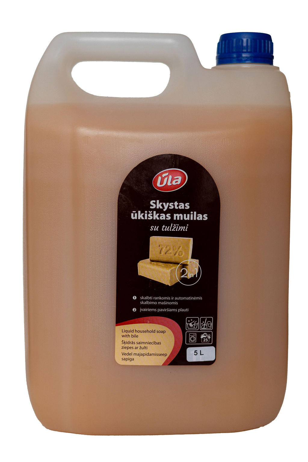 SKYSTAS ŪKIŠKAS MUILAS ŪLA SU TULŽIMI 5 L PASKIRTIS: Universali skalbimo ir valymo priemonė su ūkišku muilu ir fermentais, praturtinta natūralia tulžimi. Tinka skalbti rankomis ir automatinėmis skalbimo mašinomis. Sudėtyje esantys fermentai ir tulžis efektyviai šalina nemalonius kvapus, maisto, purvo dėmes ir kitus nešvarumus. Skalbdami vadovaukitės gamintojo rekomendacijomis. Galima valyti įvairius paviršius: duris, grindis, kriaukles ir kitus vandeniui atsparius paviršius. Valymui naudoti tirpalą: 20 ml priemonės 5 L šilto vandens. SUDĖTIS: < 5 % anijoninių aktyviųjų paviršiaus medžiagų, < 5 % nejoninių aktyviųjų paviršiaus medžiagų, < 5 % amfoterinių aktyviųjų paviršiaus medžiagų, < 5 % muilo, fermentai, konservantas, Benzisothiazolinone, Methylisothiazolinone, Laurylamine Dipropylenediamine, kvapioji medžiaga, dažikliai.
