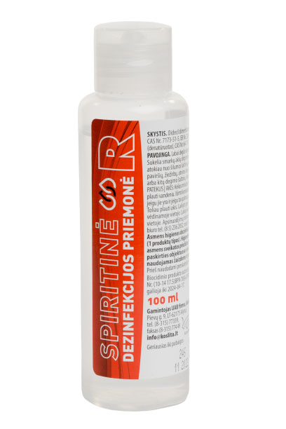 SPIRITINĖ DEZINFEKCIJOS PRIEMONĖ R 100 ML PASKIRTIS: Rankų dezinfekantas pagamintas denatūruoto etilo alkoholio pagrindu. Asmens higienos dezinfekantas (1 produkto tipas). Higieninei rankų dezinfekcijai asmens sveikatos priežiūros įstaigose, maisto pramonės, visuomeninės paskirties objektuose ir buityje. Negali būti naudojamas žaizdoms ir pažeistai odai gydyti. Biocido autorizacijos liudijimo Nr. Nr. (10-14 17.5E) BPR-512 (A-01VNO433269/B-20-274) galioja iki 2024-04-17. Sudėtis: Didecildimetilamonio chloridas, CAS Nr. 7173-51-5, EB Nr. 230-525-2, 0,25 %; etanolis (denatūruotas), CAS Nr. 64-17-5, EB Nr. 200-578-6;70,0 %. Sudėtyje yra odą minkštinančių priedų glicerino ir monopropilenglikolio. Savybės: Veikia baktericidiškai (Pseudomonas aeruginosa, Escheria coli, Enterecoccus hirae, Staphylococcus aureus, mikobaktericidiškai (TBC), fungicidiškai (Candida albicans ir A.brasiliensis ) ir virucidiškai. Naudoiimas: SPIRITINĖ DEZINFEKCIJOS PRIEMONĖ R skirta higieninei rankų dezinfekcijai asmens sveikatos priežiūros, socialinės globos ir rūpybos istaigose, kirpyklose, kosmetikos ir tatuiruočių kabinetuose, grožio salonuose, maisto pramonės įmonėse bei higieninei rankų dezinfekcijai buityje. Higieninei rankų dezinfekcijai į švarias, sausas rankas masažuojant įtrinti 3,0-5,0 ml produkto. Ekspozicijos laikas 30 sek. Ekspozicijos metu oda turi būti drėgna. Sauga: Pavojinga. Labai degūs skystis ir garai. Sukelia smarkų akių dirginimą. Laikyti atokiau nuo šilumos šaltinių, karštų paviršių, žiežirbų, atviros liepsnos arba kitų degimo šaltinių. Nerūkyti. PATEKUS Į AKIS: Kelias minutes atsargiai plauti vandeniu. Išimti kontaktinius lęšius, jeigu jie yra ir jeigu tai galima padaryti. Toliau plauti akis. Laikyti gerai vėdinamoje vietoje. Laikyti vėsioje vietoje. Laikyti vaikams neprieinamoje vietoje. Atsargumo priemonės: Nenaudoti veido odos ir gleivinių dezinfekcijai. Laikyti pašaliniams asmenims neprieinamoje vietoje. Biocidinius produktus naudokite saugiai. Prieš naudodami visuomet perskaitykite etiketę ir informaciją apie produktą.