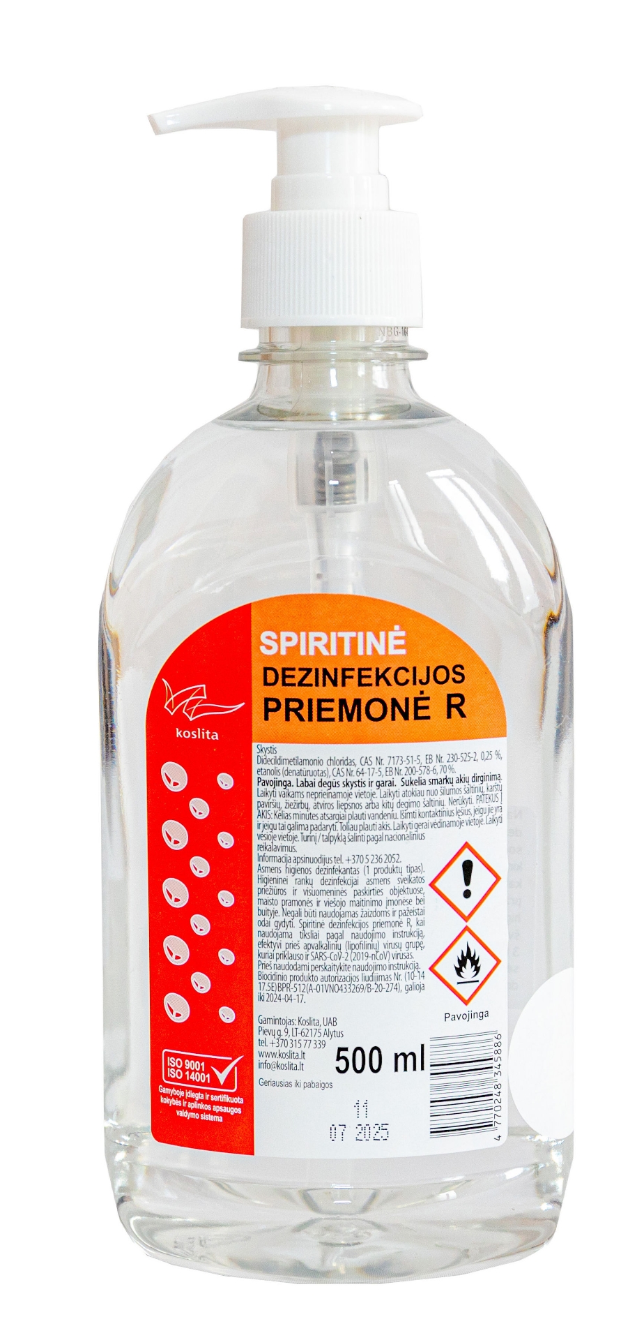 SPIRITINĖ DEZINFEKCIJOS PRIEMONĖ R SU DOZATORIUMI 0,5 L PASKIRTIS: Rankų dezinfekantas pagamintas denatūruoto etilo alkoholio pagrindu. Asmens higienos dezinfekantas (1 produkto tipas). Higieninei rankų dezinfekcijai asmens sveikatos priežiūros įstaigose, maisto pramonės, visuomeninės paskirties objektuose ir buityje. Negali būti naudojamas žaizdoms ir pažeistai odai gydyti. Biocido autorizacijos liudijimo Nr.VNO4565 galioja iki 2029-04-17. Sudėtis: Didecildimetilamonio chloridas, CAS Nr. 7173-51-5, EB Nr. 230-525-2, 0,25 %; etanolis (denatūruotas), CAS Nr. 64-17-5, EB Nr. 200-578-6;70,0 %. Sudėtyje yra odą minkštinančių priedų glicerino ir monopropilenglikolio. Savybės: Veikia baktericidiškai (Pseudomonas aeruginosa, Escheria coli, Enterecoccus hirae, Staphylococcus aureus, mikobaktericidiškai (TBC), fungicidiškai (Candida albicans ir A.brasiliensis ) ir virucidiškai. Naudoiimas: SPIRITINĖ DEZINFEKCIJOS PRIEMONĖ R skirta higieninei rankų dezinfekcijai asmens sveikatos priežiūros, socialinės globos ir rūpybos istaigose, kirpyklose, kosmetikos ir tatuiruočių kabinetuose, grožio salonuose, maisto pramonės įmonėse bei higieninei rankų dezinfekcijai buityje. Higieninei rankų dezinfekcijai į švarias, sausas rankas masažuojant įtrinti 3,0-5,0 ml produkto. Ekspozicijos laikas 30 sek. Ekspozicijos metu oda turi būti drėgna. Sauga: Pavojinga. Labai degūs skystis ir garai. Sukelia smarkų akių dirginimą. Laikyti atokiau nuo šilumos šaltinių, karštų paviršių, žiežirbų, atviros liepsnos arba kitų degimo šaltinių. Nerūkyti. PATEKUS Į AKIS: Kelias minutes atsargiai plauti vandeniu. Išimti kontaktinius lęšius, jeigu jie yra ir jeigu tai galima padaryti. Toliau plauti akis. Laikyti gerai vėdinamoje vietoje. Laikyti vėsioje vietoje. Laikyti vaikams neprieinamoje vietoje. Atsargumo priemonės: Nenaudoti veido odos ir gleivinių dezinfekcijai. Laikyti pašaliniams asmenims neprieinamoje vietoje. Biocidinius produktus naudokite saugiai. Prieš naudodami visuomet perskaitykite etiketę ir informaciją apie produktą.