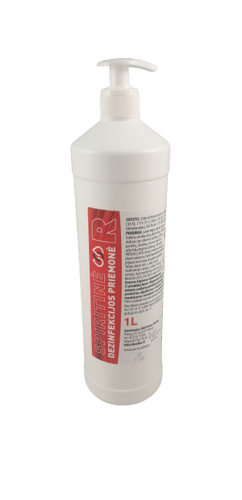 SPIRITINĖ DEZINFEKCIJOS PRIEMONĖ R SU DOZATORIUMI 1 L PASKIRTIS: Rankų dezinfekantas pagamintas denatūruoto etilo alkoholio pagrindu. Asmens higienos dezinfekantas (1 produkto tipas). Higieninei rankų dezinfekcijai asmens sveikatos priežiūros įstaigose, maisto pramonės, visuomeninės paskirties objektuose ir buityje. Negali būti naudojamas žaizdoms ir pažeistai odai gydyti. Biocido autorizacijos liudijimo Nr. Nr. (10-14 17.5E) BPR-512 (A-01VNO433269/B-20-274) galioja iki 2024-04-17. Sudėtis: Didecildimetilamonio chloridas, CAS Nr. 7173-51-5, EB Nr. 230-525-2, 0,25 %; etanolis (denatūruotas), CAS Nr. 64-17-5, EB Nr. 200-578-6;70,0 %. Sudėtyje yra odą minkštinančių priedų glicerino ir monopropilenglikolio. Savybės: Veikia baktericidiškai (Pseudomonas aeruginosa, Escheria coli, Enterecoccus hirae, Staphylococcus aureus, mikobaktericidiškai (TBC), fungicidiškai (Candida albicans ir A.brasiliensis ) ir virucidiškai. Naudoiimas: SPIRITINĖ DEZINFEKCIJOS PRIEMONĖ R skirta higieninei rankų dezinfekcijai asmens sveikatos priežiūros, socialinės globos ir rūpybos istaigose, kirpyklose, kosmetikos ir tatuiruočių kabinetuose, grožio salonuose, maisto pramonės įmonėse bei higieninei rankų dezinfekcijai buityje. Higieninei rankų dezinfekcijai į švarias, sausas rankas masažuojant įtrinti 3,0-5,0 ml produkto. Ekspozicijos laikas 30 sek. Ekspozicijos metu oda turi būti drėgna. Sauga: Pavojinga. Labai degūs skystis ir garai. Sukelia smarkų akių dirginimą. Laikyti atokiau nuo šilumos šaltinių, karštų paviršių, žiežirbų, atviros liepsnos arba kitų degimo šaltinių. Nerūkyti. PATEKUS Į AKIS: Kelias minutes atsargiai plauti vandeniu. Išimti kontaktinius lęšius, jeigu jie yra ir jeigu tai galima padaryti. Toliau plauti akis. Laikyti gerai vėdinamoje vietoje. Laikyti vėsioje vietoje. Laikyti vaikams neprieinamoje vietoje. Atsargumo priemonės: Nenaudoti veido odos ir gleivinių dezinfekcijai. Laikyti pašaliniams asmenims neprieinamoje vietoje. Biocidinius produktus naudokite saugiai. Prieš naudodami visuomet perskaitykite etiketę ir informaciją apie produktą.