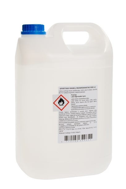 SPIRITINIS RANKŲ DEZINFEKANTAS 5 L PASKIRTIS: Asmens higienos dezinfekantas (1 produktų tipas). Higieninei rankų dezinfekcijai asmens priežiūros įstaigose, visuomeninės paskirtie objektuose, maisto pramonės ir viešojo maitinimo įmonėse bei buityje. Negali būti naudojamas žaizdoms ir pažeistai odai gydyti. Biocido autorizacijos liudijimo Nr. Nr. (10-14 17.5E)BPR-513 (A-01VNO593592/A-20-273) galioja iki 2025-08-03. Sudėtis: etanolis (denatūruotas), CAS Nr. 64-17-5, EB Nr. 200-578-6;80,0 %. Sudėtyje yra glicerolio, vandenilio peroksido. Savybės: Veikia baktericidiškai (Pseudomonas aeruginosa, Escheria coli, Enterecoccus hirae, Staphylococcus aureus) fungicidiškai (Candida albicans ir A.brasiliensis). Naudoiimas: Higieninei rankų dezinfekcijai į švarias sausas rankas masažuojant įtrinti 3,0 -5,0 ml produkto. Ekspozicijos laikas 30 sek. Ekspozicijos metu oda turi būti drėgna. Sauga: Pavojinga. Labai degūs skystis ir garai. Laikyti vaikams neprieinamoje vietoje. Laikyti atokiau nuo šilumos šaltinių, karštų paviršių, žiežirbų, atviros liepsnos arba kitų degimo šaltinių. Nerūkyti. Talpyklą laikyti sandariai uždarytą. Turinį/talpyklą šalinti pagal nacionalinius reikalavimus. Atsargumo priemonės: Laikyti pašaliniams neprieinamoje vietoje. Laikyti pakuotę sandariai uždarytą, ne aukštesnėje kaip +25 °, vengti tiesioginių saulės spindulių. LAIKYMAS: Tinka naudoti 24 mėn. nuo pagaminimo datos. Biocidinius produktus naudokite saugiai. Prieš naudodami visuomet perskaitykite etiketę ir informaciją apie produktą.