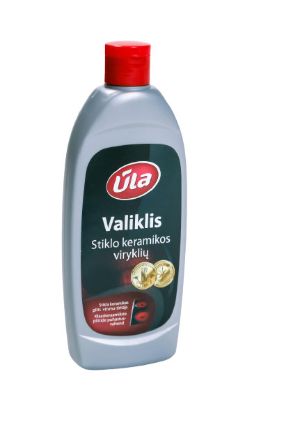 STIKLO KERAMIKOS VIRYKLIŲ VALIKLIS ŪLA 250 ML PASKIRTIS: Stiklo keraminių viryklių valiklis „Ūla“ nepamainomas pagalbininkas virtuvėje. Gerai nuvalo įvairius nešvarumus nuo viryklių stiklo keraminių paviršių. Sudėtyje nėra jokių tirpiklių, nebraižo paviršių.