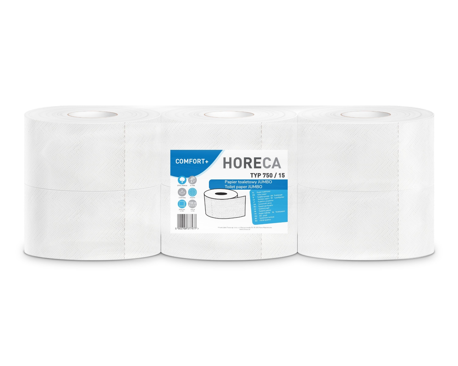 TUALETINIS POPIERIUS JUMBO HORECA COMFORT+ 2 sluoksniai, 150 m Baltos spalvos, celiuliozė. Lapelio dydis: 90x20 mm. Lapelių kiekis rulone: 750....