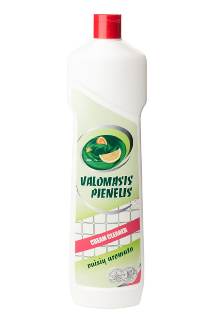 VALOMASIS PIENELIS CREAM CLEANER VAISIŲ AROMATO 0,6 KG PASKIRTIS: Valyti keraminius, plastikinius paviršius, emaliuotas dangas, virykles, puodus, keptuves bei kitą virtuvės įrangą, vonias, kriaukles. Nenaudoti lakuotiems paviršiams valyti. Tirštos kremo konsistencijos valiklis nenuteka nuo vertikalių valomų paviršių, o plovikliai bei specialus dolomitų užpildas veiksmingai šalina net ir pridžiūvusius nešvarumus ir nebraižo valomų paviršių.