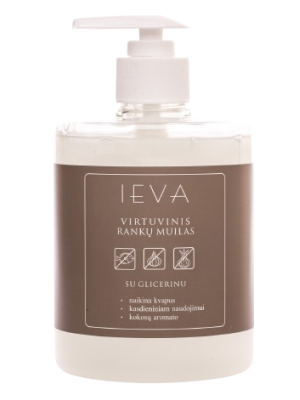 VIRTUVINIS RANKŲ MUILAS IEVA 0,5 L PASKIRTIS: Skirtas plauti rankas maisto pramonės įmonėse, sveikatos priežiūros įstaigose, viešbučiuose, komunaliniuose objektuose ir buityje. NAUDOJIMAS: naudojamas neskiestas. Ant sudrėkintų vandeniu ranku vieną kartą paspaudus muilo dozatoriaus rankenėle, užlašinti skysto muilo. Kruopščiai 10-15 sek. plauti rankas, nuskalauti vandeniu ir nusausinti vienkartiniu rankšluosčiu arba servetėle. SUDĖTIS: švelnios, augalinės kilmės paviršinio aktyvumo medžiagos, glicerinas, nemalonų kvapą naikinantis priedas. SAVYBĖS: tirštas, koncentruotas, švelnus rankoms, gausiai putojantis, efektyviai plaunantis su įvairiais pagerinančiais priedais. Malonaus kvapo. Muilo sudėtyje esantis glicerinas minkština, drėkina odą. Dėka specialių komponentų turi savybę naikinti maisto kvapus nuo odos bei užtikrina ilgalaikę rankų gaivą. SAUGAUS DARBO TAISYKLĖS: naudoti pagal paskirtį. LAIKYMAS: Laikyti sausoje, vėsioje vietoje.