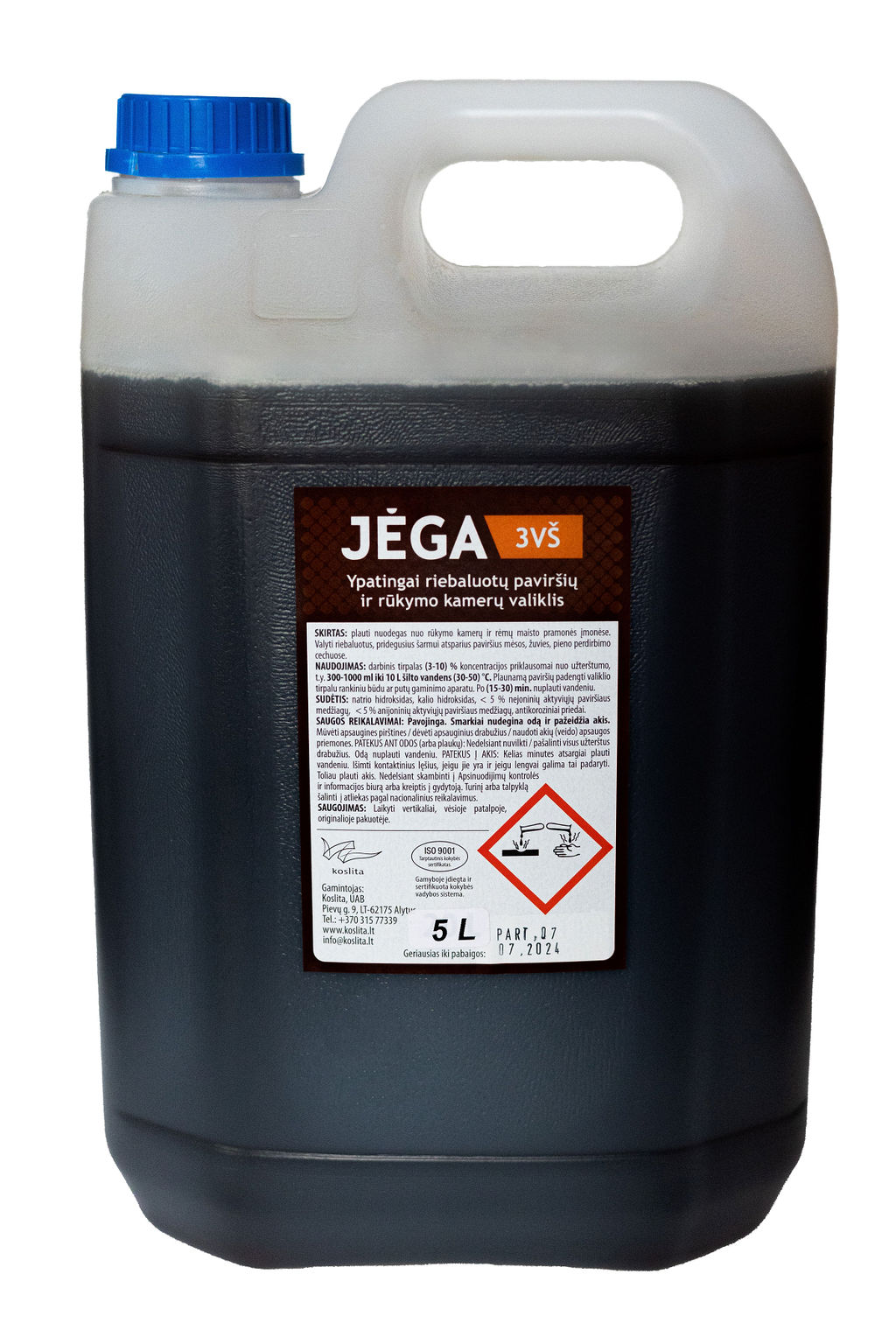 YPATINGAI RIEBALUOTŲ PAV. IR RŪKYMO KAMERŲ VALIKLIS JĖGA-3VŠ 5 L PASKIRTIS: Skirtas nuodegų plovimui nuo rūkymo kamerų ir rėmų maisto pramonės įmonėse. Tinka ypač riebaluotų, pridegusių, aprūkusių, šarmui atsparių paviršių valymui mėsos, žuvies, pieno perdirbimo cechuose. Stiprus šarminis produktas (pH-13,0). NAUDOJIMAS: naudojamas 3-10 % koncentracijos darbinis tirpalas, priklausomai nuo užterštumo. Ruošiant 10 l darbinio tirpalo pilti atatinkamai 300-1000 ml – iki 10 l šilto (30-50) ºC vandens. Plaunamą paviršių padengti valiklio tirpalu rankiniu būdu ar putų gaminimo aparatu, po 15-30 min. nuplauti vandeniu. SUDĖTIS: Natrio hidroksidas, nejoninė paviršinio aktyvumo medžiaga, anijoninė paviršinio aktyvumo medžiaga, antikoroziniai priedai. SAUGOS PRIEMONĖS: Pavojinga. Sudėtyje yra Natrio hidroksido. Smarkiai nudegina odą ir pažeidžia akis. Mūvėti apsaugines pirštines/ dėvėti apsauginius drabužius/naudoti akių (veido) apsaugos priemones. PATEKUS ANT ODOS (arba plaukų): Nedelsiant nuvilkti/pašalinti visus užterštus drabužius. Odą nuplauti vandeniu/čiurkšle. PATEKUS Į AKIS: Kelias minutes atsargiai plauti vandeniu. Išimti kontaktinius lęšius, jeigu jie yra ir jeigu lengvai galima tai padaryti. Toliau plauti akis. Nedelsiant skambinti į Apsinuodijimų kontrolės ir informacijos biurą arba kreiptis į gydytoją. Turinį arba talpyklą šalinti į atliekas pagal nacionalinius reikalavimus. SAUGOJIMAS: Laikyti vertikaliai, vėsioje patalpoje, originalioje pakuotėje.