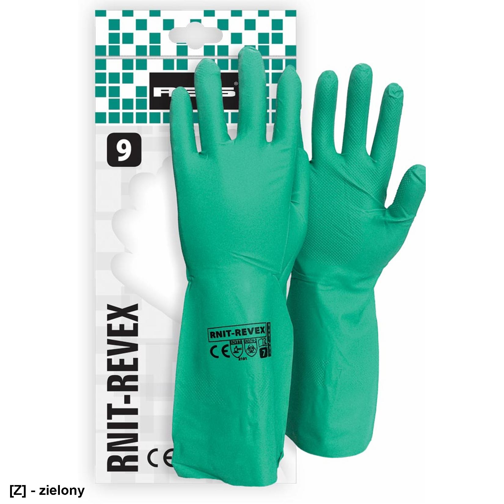 REIS RNIT-REVEX Z nitrilinės apsauginės pirštinės M (dydis 8) – tvirtas ir elastingas darbo pirštines modelis su chropowatu paviršiumi ir pusės dilbio ilgio mankštetu, atsparus riebalams, aliejams ir cheminiams poveikiams, patogiai supakuotas po vieną porą, tinkamas naudoti maisto pramonėje ir sudėtingesnėse darbo sąlygose.