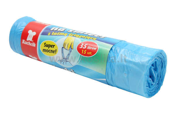 MAIŠAI ŠIUKŠLĖMS 35 L UŽRIŠAM Tai tvirti, mėlynos spalvos, 35 litrų talpos šiukšlių maišai su patogia užrišama juostele. Maišai pagaminti iš HDPE (didelio tankio polietileno) ir turi 20 mikronų storį, todėl yra patvarūs ir tinkami kasdieniam atliekų surinkimui namuose ar biuruose. Pakuotėje yra 15 vienetų​